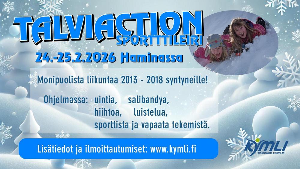 Talvilomalla vauhdikasta menoa Haminassa! TalviAction-leiri tiistaina ja keskiviikkona 24.-25.2.2026 on alakouluikäisille (2013-2018) suunnattu matalankynnyksen liikuntaleiri. Päivä sisältää…