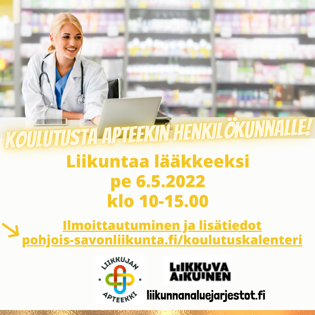 Liikuntaa lääkkeeksi -koulutuksessa osallistuja saa eväitä liikuntaneuvonnan ja terveysliikunnan edistämiseen lääkehoidon tukena. Koulutuksessa käsitellään aktiivisen elämäntavan ja liikunnan merkitystä yleisimpien kansansairauksien ehkäisyssä ja hoidossa lääkehoidon tukena. Tarkemmassa käsittelyssä ovat sepelvaltimotauti, eteisvärinä, astma, keuhkoahtaumatauti, 2-tyypin diabetes ja aivoverenkiertohäiriöt. Lisäksi koulutuksessa verkostoidutaan ja kuullaan muiden apteekkien hyviä malleja ja toimivia käytäntöjä.